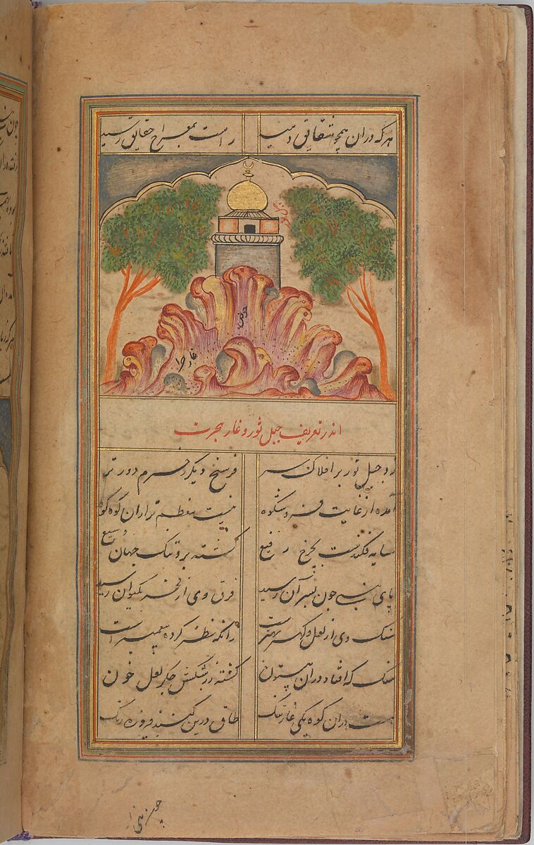 The Futuh al-Haramayn is a poetic description of the Holy Cities of Mecca and Medina, composed by Muhi al-din Lari in the early sixteenth century. Often lavishly illustrated, it provides instructions on the hajj pilgrimage rituals and descriptions of important sites Muslim pilgrims can visit. The Futuh was popular in the sixteenth and seventeenth centuries, when it was mainly copied in the Ottoman realm from Mecca to Istanbul, and also in Central Asia and India. Illustrations of sites and buildings are commonly shown from a bird’s-eye view. Symbols and other details enable the reader to identify sites where important miracles of the Prophet and other events took place. Differences in style and quality exist. This Deccani version presents considerable flourish through the curving orange lines of the trees, animated purple mountains concealing hidden grotesques at their rocky edges, and bright palette.