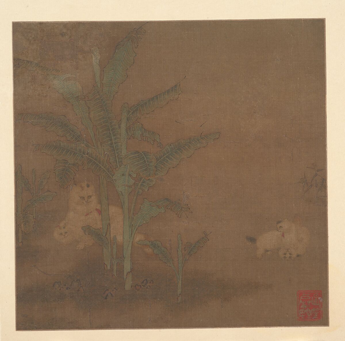 Kittens in a garden setting was a favorite subject of Academy painters during the Song dynasty. Here, the young ones play while the mother watches. New banana plants and shoots, their leaves not yet unfurled, have just emerged, but a sprig of bamboo visible along the right-hand margin of the painting is still without its summer greenery.