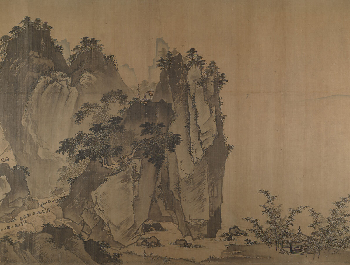 This is the second half of a handscroll that was separated into two pieces. The work follows the style of the thirteenth-century painter Xia Gui, whose sharp, angular brushwork and evocative, mist-shrouded scenes were much admired in the fifteenth century, especially at the Ming-dynasty court. The composition is based in part on Xia’s Pure and Remote View of Streams and Mountains (National Palace Museum, Taiwan). The survival of other oversize copies of Pure and Remote View from this period attests to the painting’s popularity among fifteenth-century patrons.