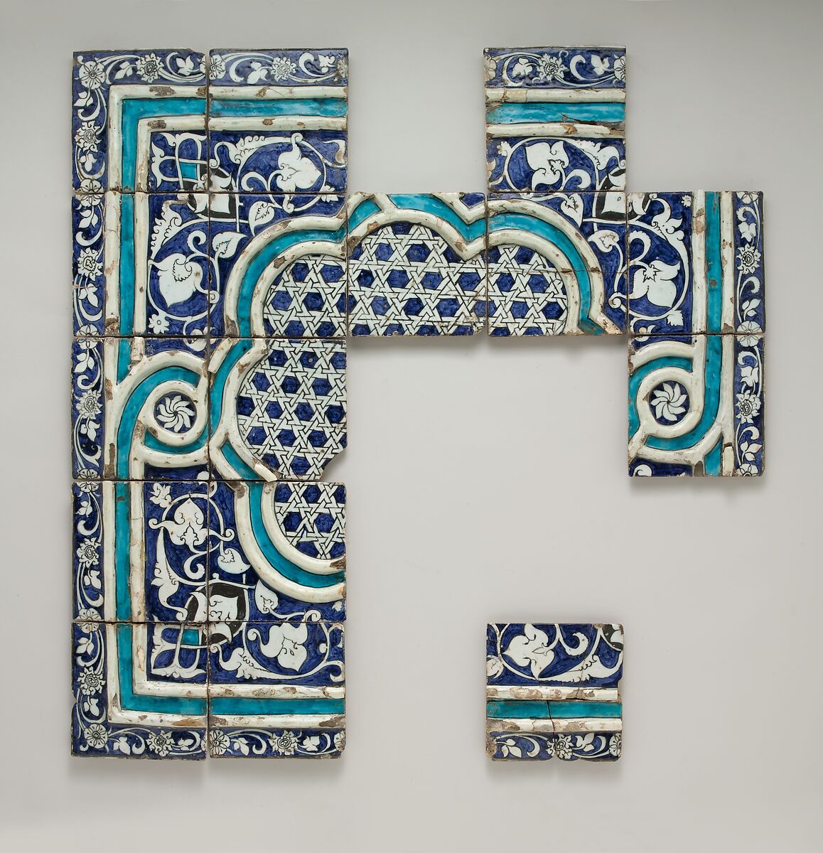 These tiles represent a ceramic type produced by the workshop of Ibn al-Ghaibi al‑Tawrizi, which operated out of Damascus in the early fifteenth century before relocating to Cairo. The panel is so similar in technique, composition, and style to one signed by Ghaibi and still extant in the funerary complex of Ghars al‑Din al‑Tawrizi (d. 1430) in Damascus that it probably came from that very building. The Museum holds more than a dozen sherds bearing the signature of this workshop, as well as a ceramic mosque lamp signed by the son of Ghaibi—evidence that Ghaybi's son continued in the trade.