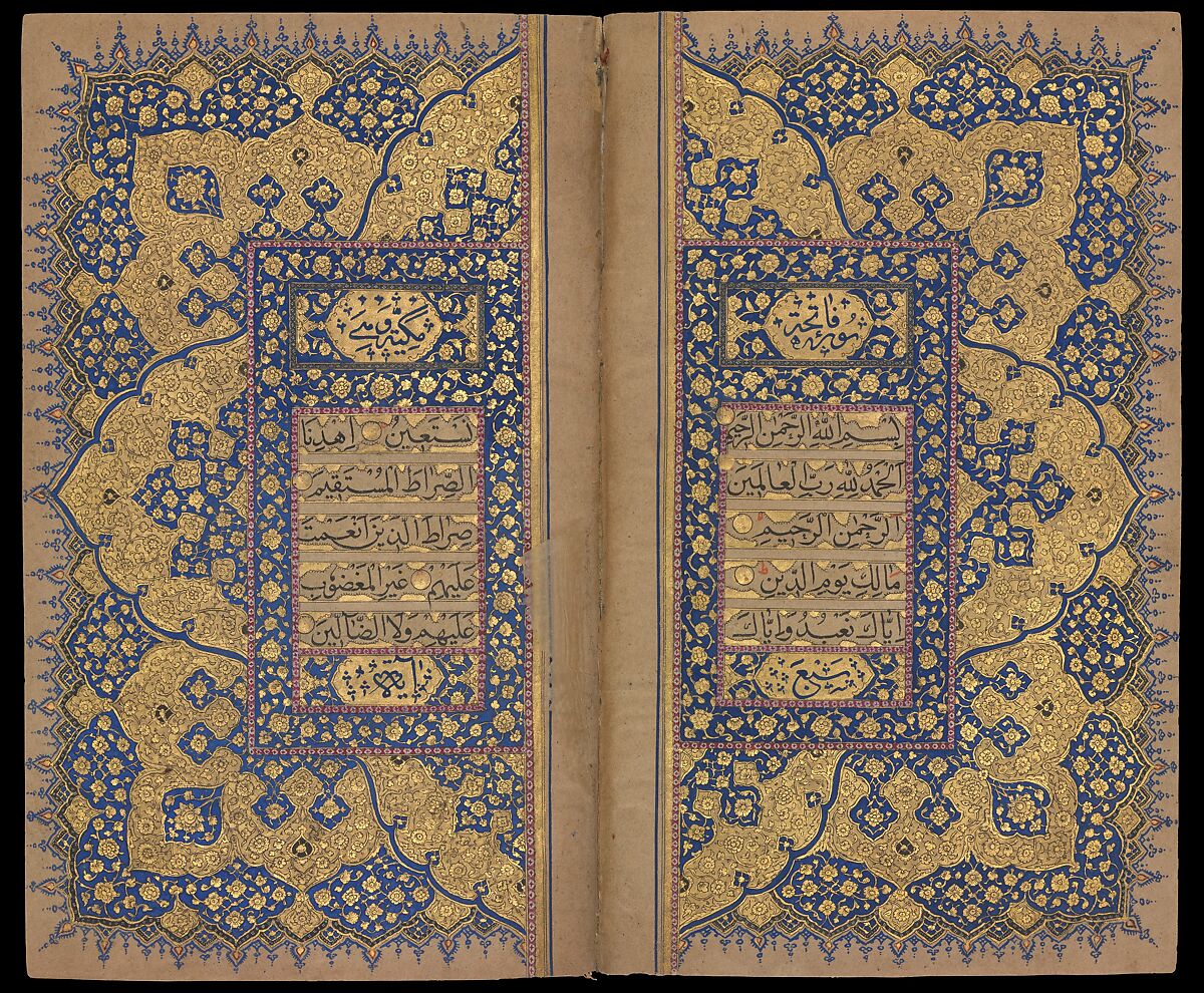The lavish illumination found at the opening to nine of the suras, or chapters, of this Qur'an (al-Fatiha, al-Ma'ida, Yunus, Bani Isra'il, al-Shu'ara, Qaf, al- Falaq, and al-Nas) is in a blue and gold palette that is characteristic of the production of Kashmir.