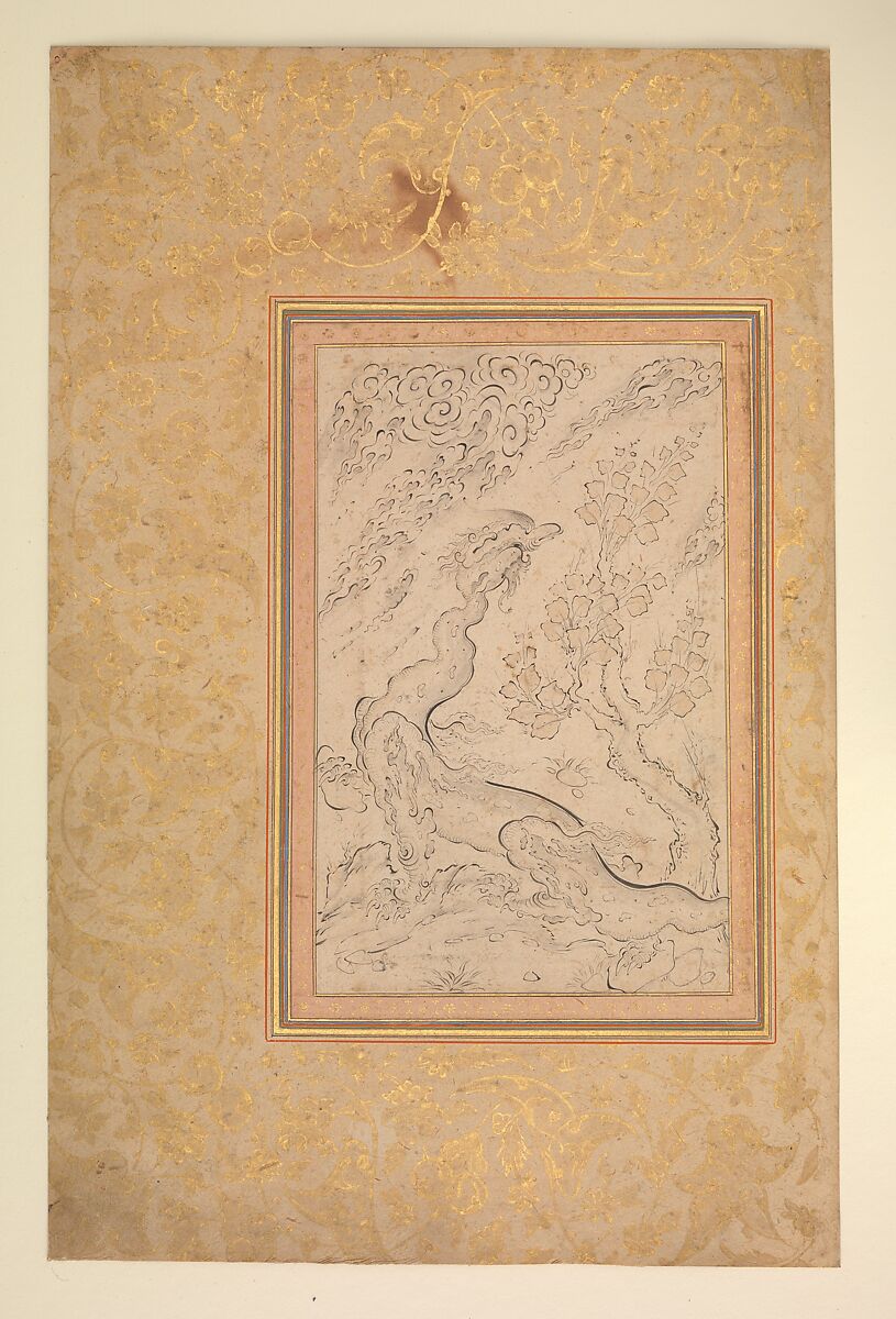 As the dragon emerges from the natural landscape, the sinuous line of its silhouette mimics those of its surroundings. In the late sixteenth century, the production of single‑page, finished drawings destined for albums increased; numerous pictures of dragons, either alone or in combat with men or other animals, were executed. This work is attributed to Sadiqi Beg, who, along with Riza‑yi 'Abbasi, was one of the pioneers of the calligraphic style of drawing in Iran.