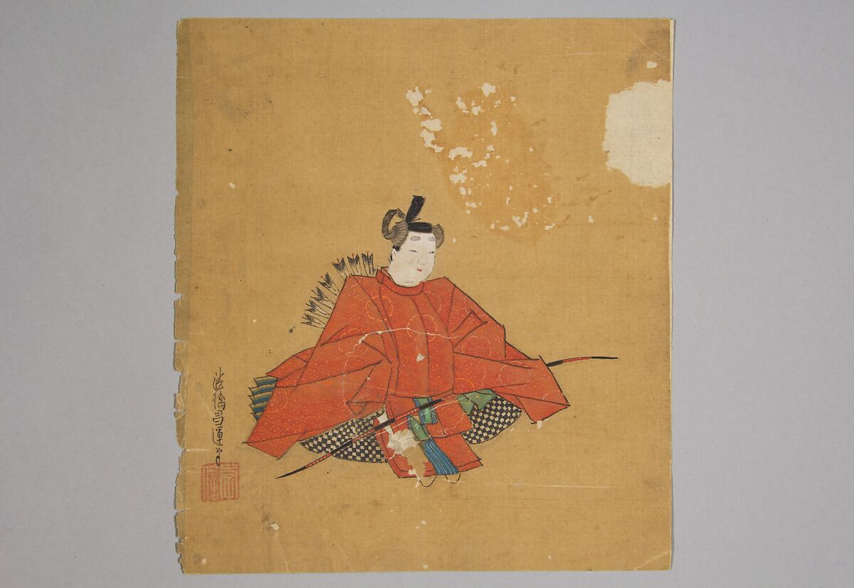 - Medium: Unmounted shikisi leaf; ink and color on silk