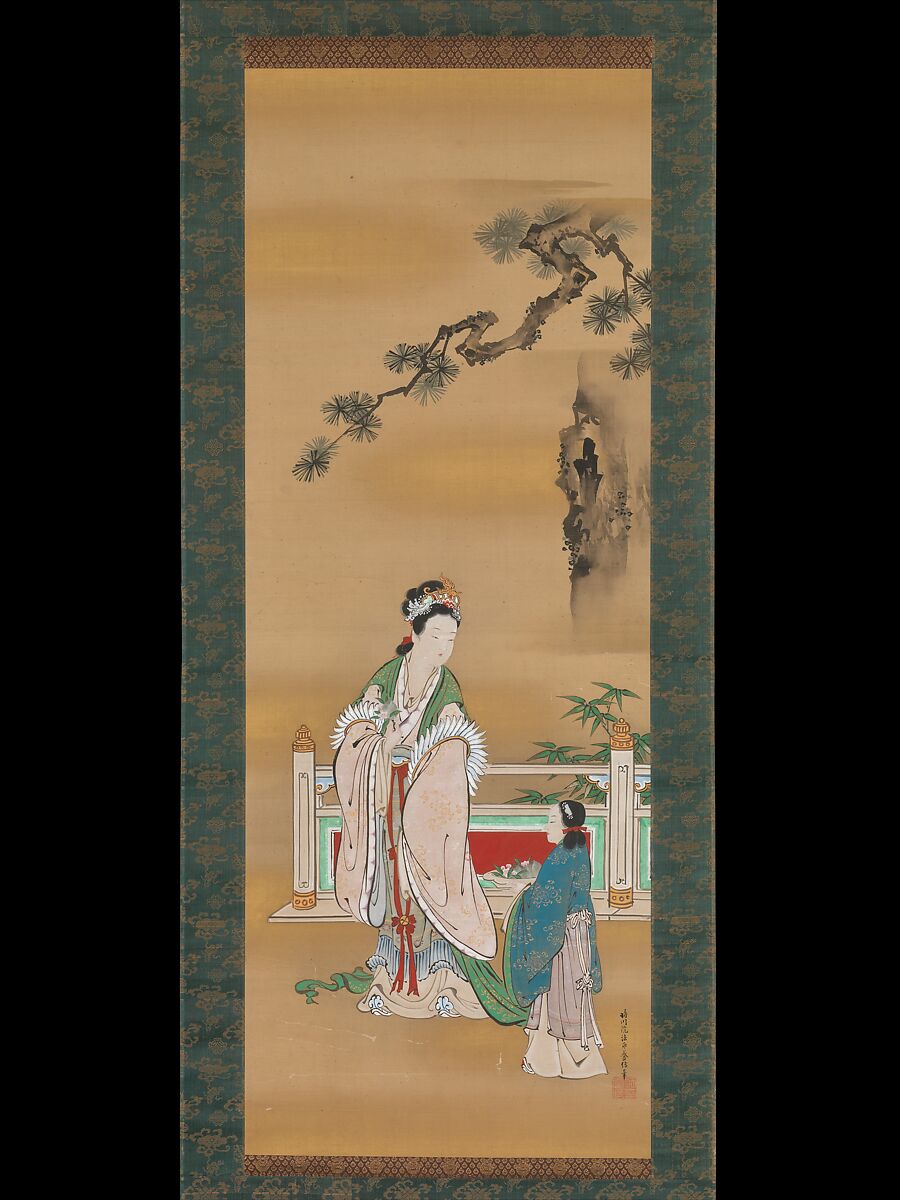The Queen Mother of the West, the Daoist immortal known in China as Xiwangmu (Japanese: Seiōbo), was one of the most popular Chinese themes among painters in premodern Japan. Believed to reside on Mount Kunlun, a mythical paradise in the far west of China, she is a formidable deity in the ancient Daoist pantheon. In paintings, Xiwangmu is usually depicted with the image of a phoenix on her headdress, as in this work, and with an attendant holding a bowl of peaches, a symbol of longevity. The peaches in her orchard ripen every three thousand years.