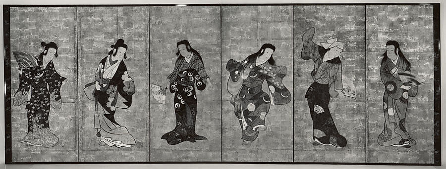 The male and female performers on this screen wear sumptuously decorated kosode. The hairstyles and decorative motifs on the costumes reflect fashion trends of the Kanbun period (1661–72), though the work might have been painted slightly later. The well-balanced presentation of figures embodies the elegance and reserved movements of Japanese dance. It also points to the importance of fans in the overall scheme of a performance and demonstrates how the flowing sleeves of a costume were used to accent the fluid lines created by dancers.