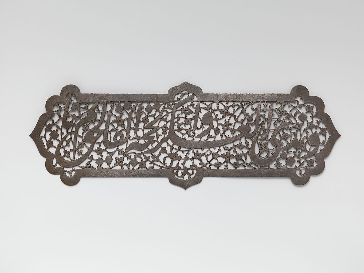 This pierced steel plaque contains an inscription in fluid nasta‘liq script against a background of vegetal scrolls, which praises the Prophet, his daughter Fatima, and the Twelve Shi‘i Imams (the Chahardah Ma‘sum, or Fourteen Infallibles). The openwork casts a delicate shadow as light filters through its perforations. Similar plaques were placed on entryway doors surrounding the cenotaphs of holy personages in Shi‘i shrines in Iran.