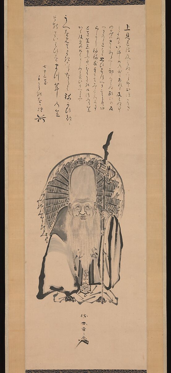 Katsukawa Shunshō was a major ukiyo-e painter and print designer active in the latter half of the eighteenth century; a painting of Fukurokuju seems a departure from his usual subjects of beauties and actors. Most likely done late in his life, this hanging scroll painted in an eccentric, bravura ink style must have had personal meaning and may have been created in the company of friends. The inscription on the top, which postdates the painting, is by the kyōka poet Tegara no Okamochi (1734–1812), who is best known for a poem on old age titled Year's End: