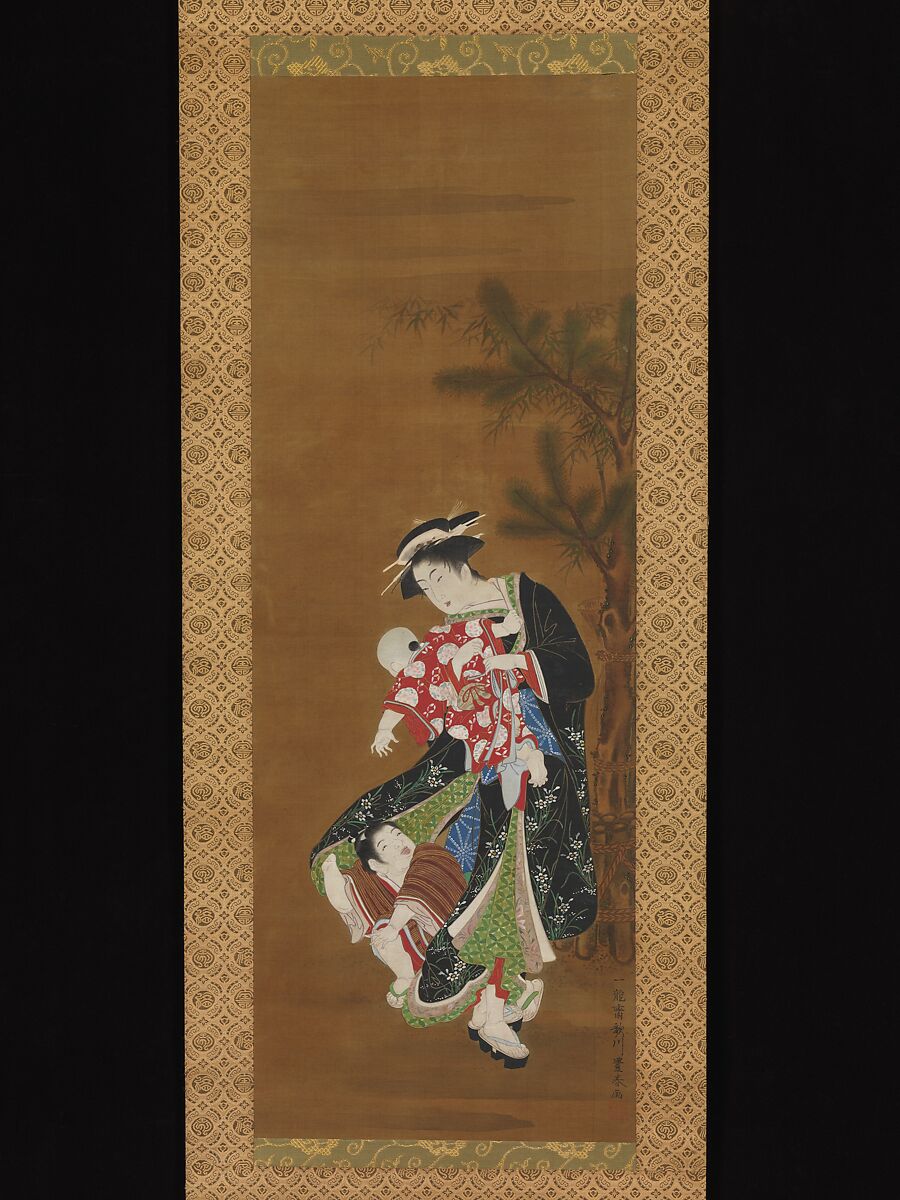 Here, a boy entertains his younger brother by hiding in the layers of their mother's kimono while she tries to hold onto the wriggling child. The playful, swirling movement of the three figures reflects the pleasant festivities of the New Year season, represented by the pine and bamboo decoration in the background.