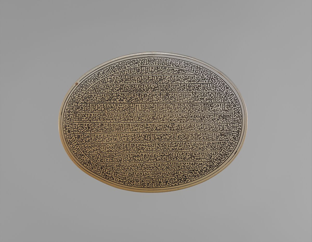 This oval-shaped agate gemstone has been inscribed with verses from the Qur’an and bears the names of the Prophet Muhammad and his cousin and son-in-law ʿAli, which are written in ghubar or dust-like tiny script. It may have originally been set into a jewel—perhaps a bazuband (armband) or a pendant—and worn on the body as a talisman, where the holy verses would have protected the wearer.