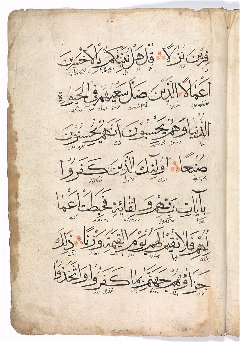 This Qur’an folio, which is one of a group of ten, is written in muhaqqaq script. Each folio has seven lines with interlinear Persian translation in naskhi script. The verses 102-110 belong to Surah Kahf (The Dwellers of the Cave, Chapter 18).