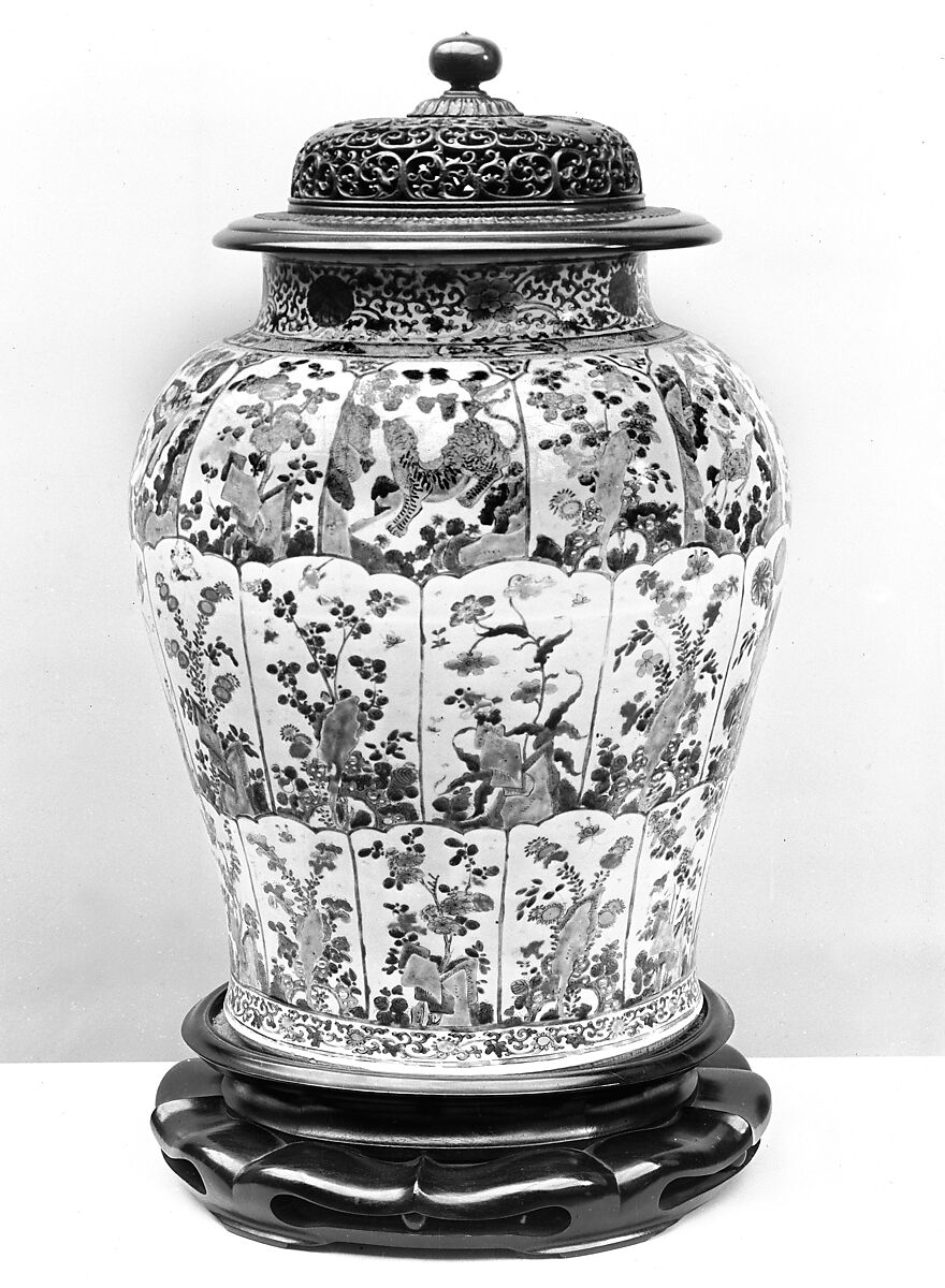 - Medium: Porcelain painted in overglaze polychrome enamels (Jingdezhen ware), wooden cover and stand
