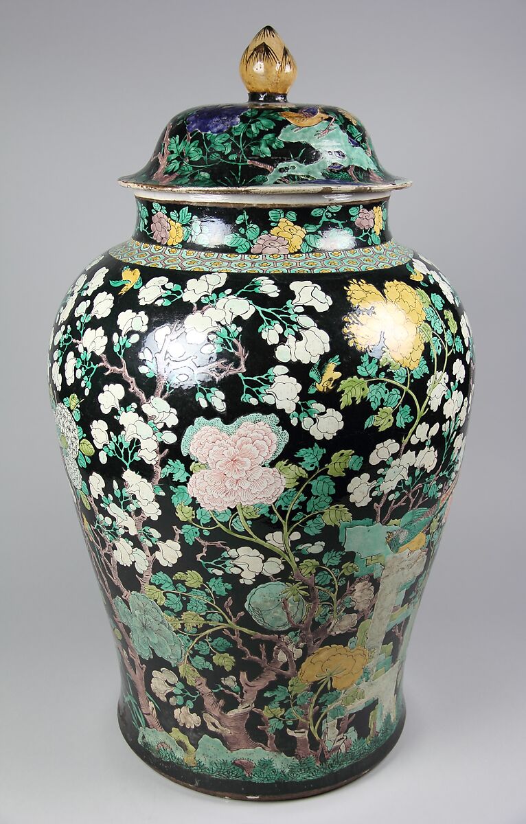 - Medium: Porcelain painted in overglaze polychrome enamels (Jingdezhen ware, famille noir)
