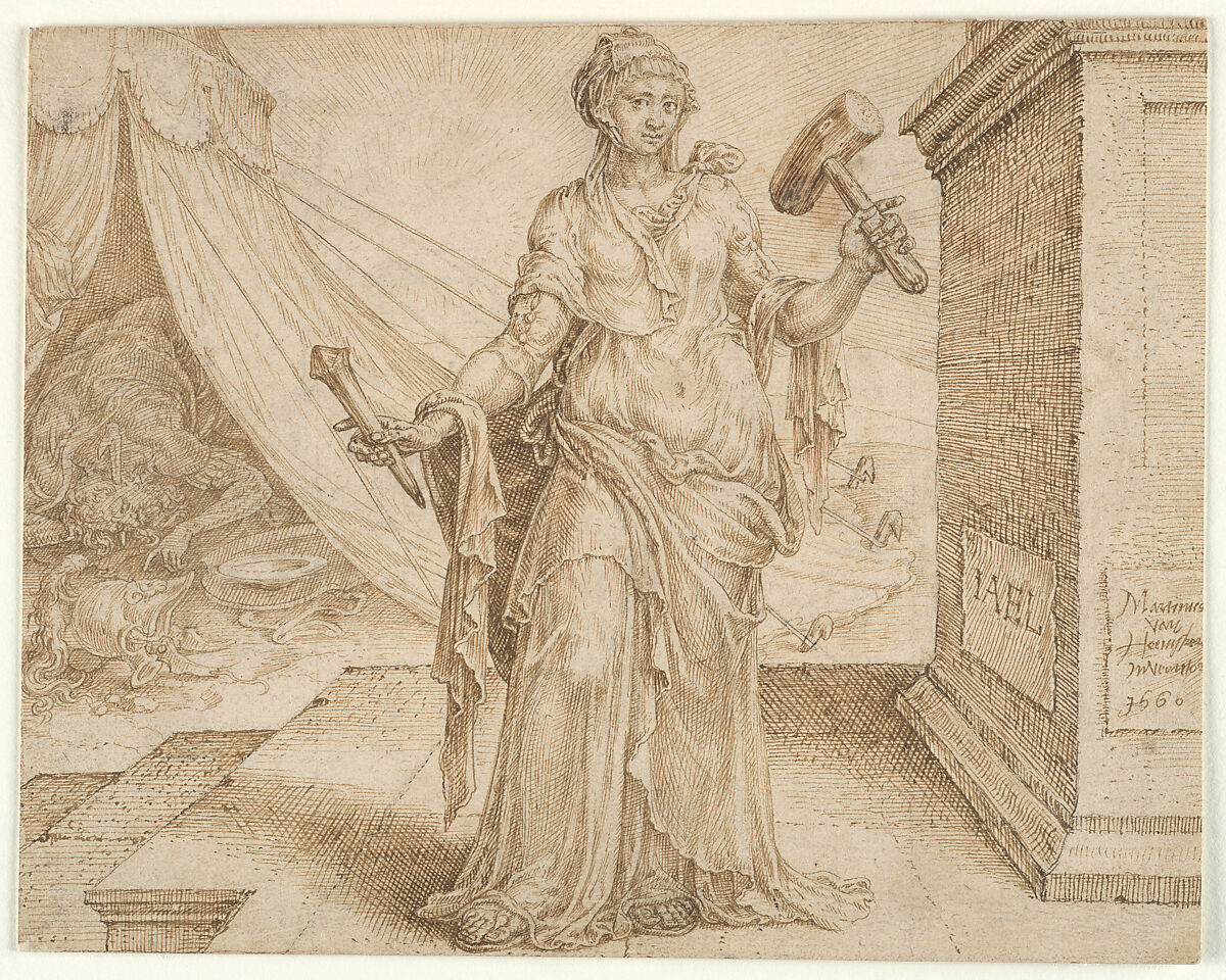 Jael, who killed Sisera, commander of the Canaanite forces, by driving a stake through his temple (Judges 4:17-21), is one of the Eight Exemplary Women from the Old and New Testament who are represented in a series of engravings (printed around 1560) after designs by van Heemskerck, of which this drawing is one. The engravings attained instant renown, for by 1568 they were mentioned in the second edition of Vasari’s Vite. Marten van Heemskerck was one of the first Netherlandish artists to make designs expressly for reproduction by professional printmakers. The almost seven hundred engravings and etchings after his designs had a lasting impact on subsequent generations of Dutch painters.