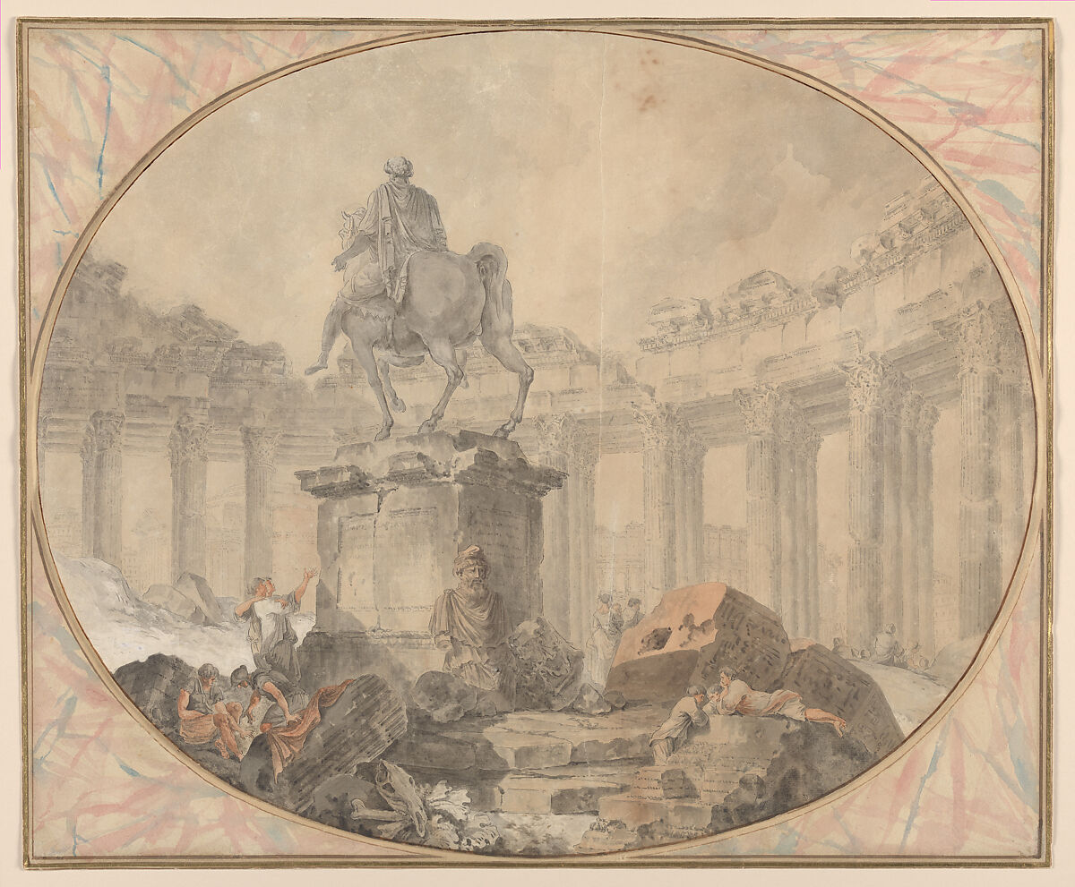 The painter and draftsman Hubert Robert, who spent eleven years in Rome (1754-65) studying at the French Academy, is known for his picturesque capriccios - views of the city combining real and imaginary ancient monuments. This capriccio features the famous ancient bronze equestrian statue of Marcus Aurelius. Robert rendered the statue accurately, but its crumbling stone pedestal and its inscription, altered to include his own name, are inventions. The statue is surrounded by an arcade reminiscent of Bernini’s colonnade for the piazza of Saint Peter’s, which is modified in detail and proportion by architectural elements from the Pantheon. Robert has surrounded the statue with an animal skull, bones, and fragments of architectural ruins, an allusion to the past glory of the Roman Empire.