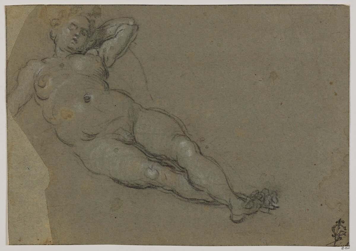 Domenico was the son and pupil of the renowned Venetian master, Jacopo Tintoretto. While the influence of Jacopo’s rhythmical line is evident in the drawings of his son, Domenico developed an individual style of draftsmanship characterized by softer and more naturalistic modeling, as illustrated in this study of a female nude, one in a series depicting heavily foreshortened figures in various reclining poses, including several others in the Lehman Collection. These studies may have served as reference points for the voluptuous, recumbent figures of Venus and Danae that abound in paintings by the Tintoretto workshop Domenico’s series of female nudes epitomize the primacy of drawing after live models in the Tintoretto workshop.