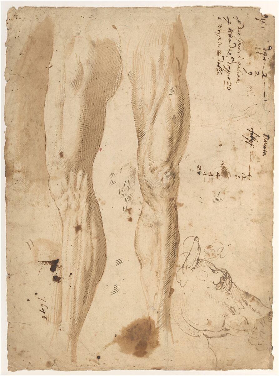 The detailed explorations of the muscular structure of the human leg, seen from varying points of view in this sheet, attest to the importance of anatomical studies during the Renaissance. In order to better understand the human form, artists such as Leonardo and Michelangelo carried out dissections. The unrelated annotations of accounting information in the right margin were written by a later hand.