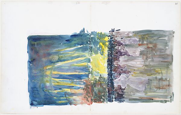 Prendergast uses thin washes of color to lay in this image of figures in a park and an evening sky all ablaze. The firework display is wonderfully handled in vertical bands of spatial narrative, extending across a page spread. The artist has blotted his sheet in areas of light to suggest even greater luminosity.