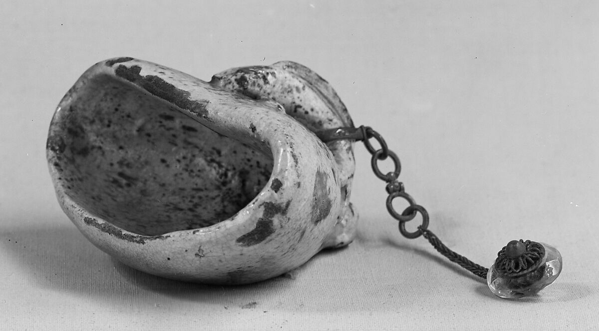 - Medium:Pottery covered with glaze; silver chain and glass netsuke (Kyoto ware)