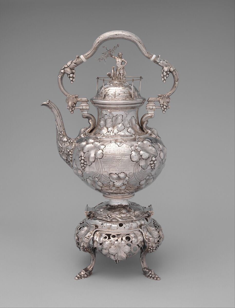 In 1850, Marshall Lefferts, president of the New York and New England and the New York State telegraph companies, was presented with "a splendid service of plate" to honor his construction of telegraph lines from New York to Boston and Buffalo. It was designed by John C. Moore in the "modern French" style, with floral chasing and rusticated castings. Surmounting the kettle is a figure of Zeus holding lightning bolts—an allegory of electricity.