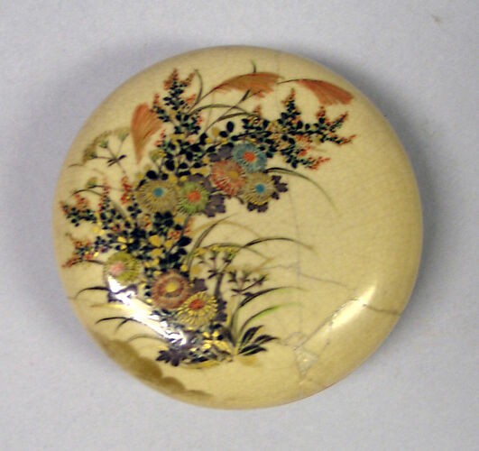 - Medium: Clay covered with a transparent crackled glaze; decorated colored enamels and gold (Kyoto ware, Takamatsu type)