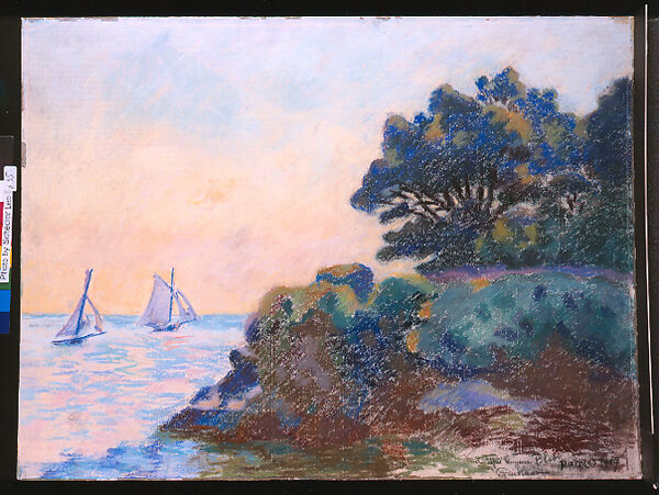 Drawn in sharply contrasting values, this pastel landscape recalls those of Claude Monet made half a century earlier. Guillaumin probably sketched this scene near Agay on the Cote d’Azur, a fishing town he visited intermittently for forty years beginning in 1887.