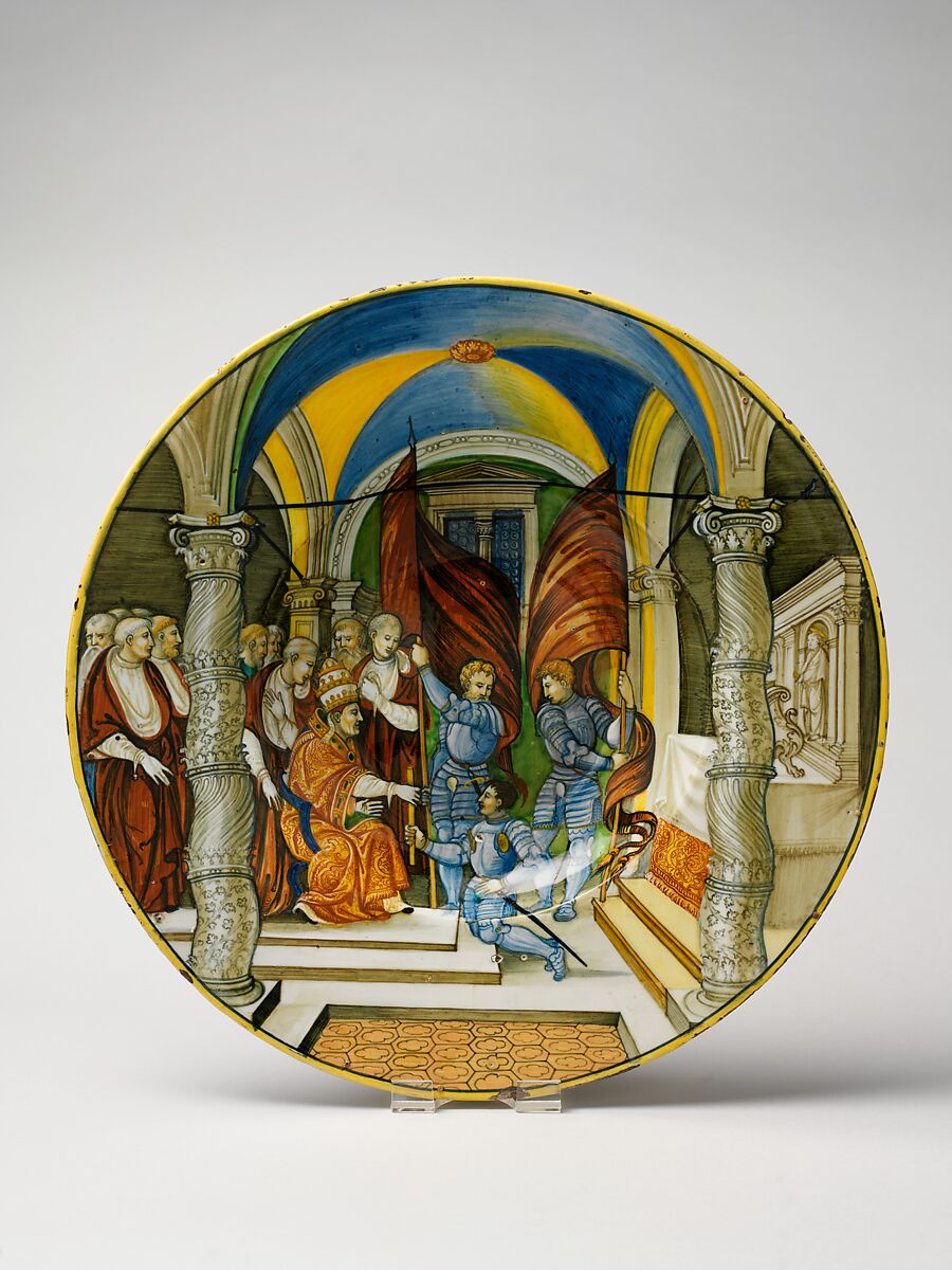 - Title: Large Dish (tagliere): Pope Leo X presenting a baton to Federigo II Gonzaga, marquis of Mantua, on his appointment as captain general of the Church in 1521.