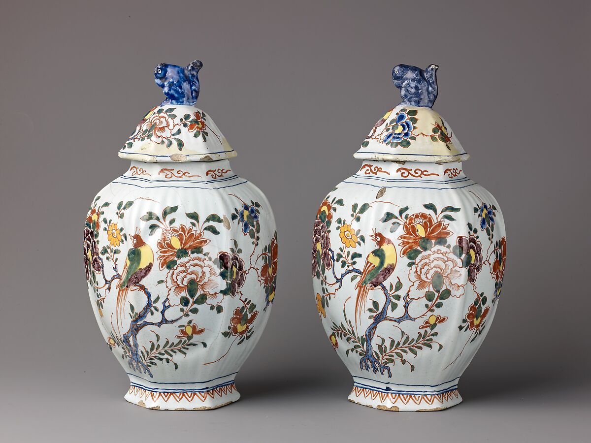 - Title:Covered Jar, polychrome floral decoration, handle on cover in shape of squirrel.