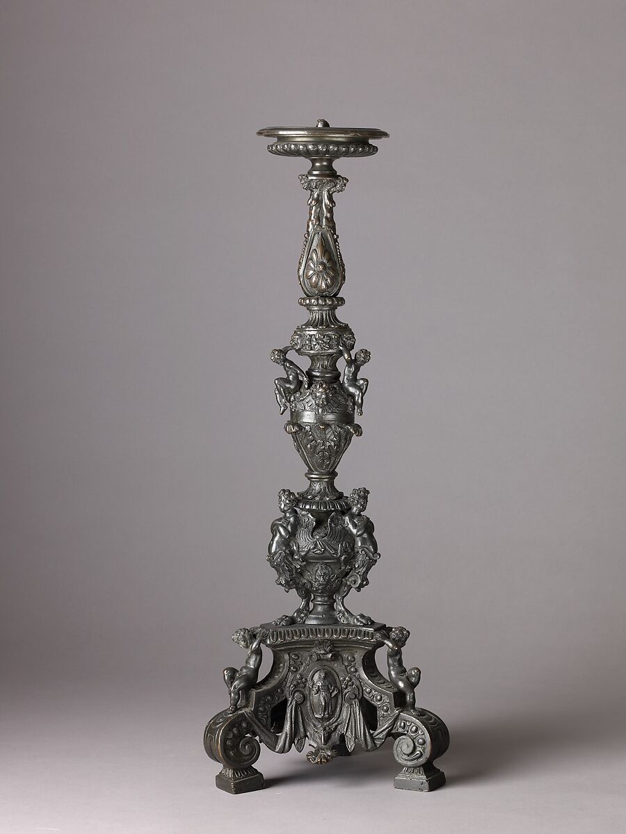 This candlestick (part of a pair with 1975.1.1380) may have been used in an ecclesiastical setting. One of the roundels between their legs contains a cross, while another contains the figure of a saint. The attributes of the saint—an open book and the IHS monogram—suggest that he can be identified as Saint Bernardino of Siena, an influential fifteenth-century Franciscan preacher who was canonized in 1450. Although the coat of arms in the third roundel has not yet been linked with a specific family, they are probably those of the family who commissioned the pair.