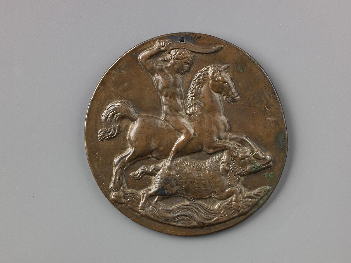The plaquette depicts Meleager on horseback hunting the Calydonian Boar. Other versions are in the Bode Museum, Berlin, the Louvre, Paris, and the National Gallery of Art, Washington, D.C.; the figure of Meleager has been derived from an antique sarcophagus relief. This work is an aftercast, possibly from the seventeenth century.