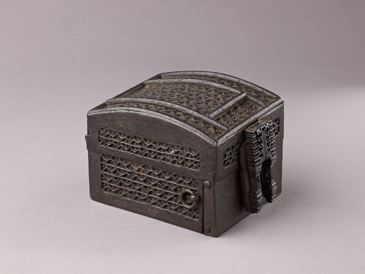 Caskets such as this one must have been produced in large quantities, as numerous examples remain. They were called coffret à mailles or à la manière d’Espagne, in connection to the fine iron tracery of the sides and cover. Sometimes referred to as a missal box, this type probably preserved precious objects such as jewelry or small illuminated prayer books. This small box has two suspension rings to carry it, possibly on a girdle. The front is probably an old replacement.