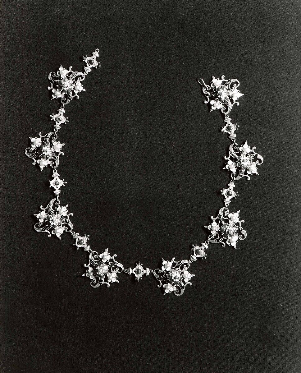 This necklace was assembled, probably in the nineteenth century, from eight clothing ornaments dating to the early seventeenth century. The prevalence of these ornaments, called boglar, in sixteenth and seventeenth-century inventories of Hungarian women, suggests that they were relatively inexpensive, a theory supported by the minimal use of precious metal. The jewels were frequently marked on the back, presumably by the maker, with initials; in the case of the present example, “AVB.”