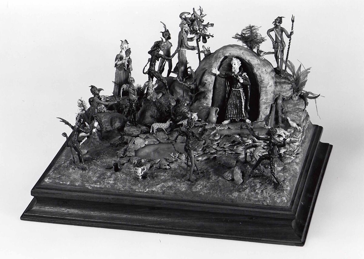 - Medium: Figures of lampworked glass (opaque and translucent white, brown, yellowish brown, black, yellow, blue, light blue, turquoise blue, amethyst, green, pink, gray, tan, and colorless), composition material (plaster ?), glass mirror plate, wood, wire, shells, feathers, paper, paint. Assembled.