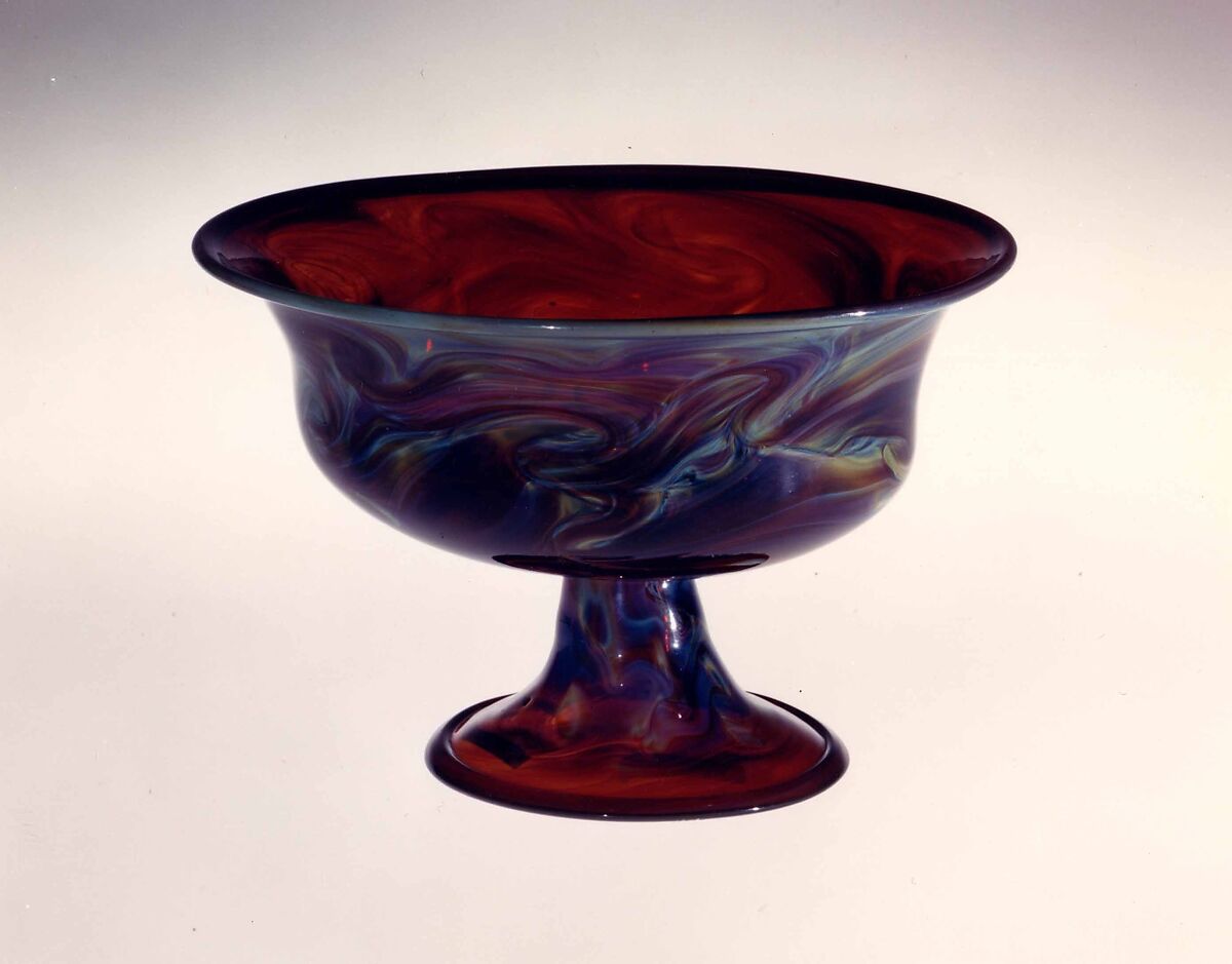 - Medium: Translucent red nonlead glass with multicolored marbling on the exterior. Blown.