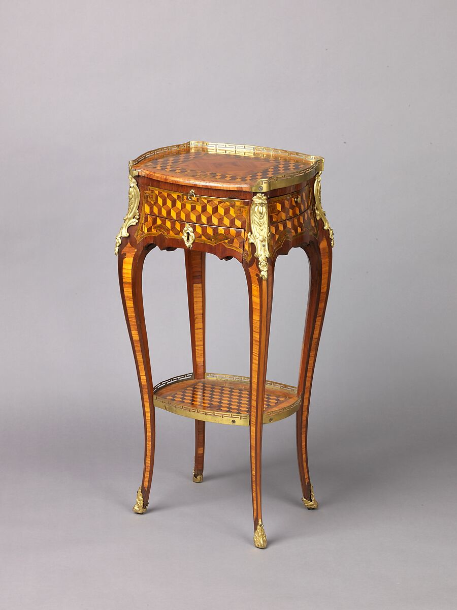 - Medium: Oak veneered with tulipwood, amaranth, and sycamore; gilt-bronze mounts; leather dyed black with gold-tooled border.