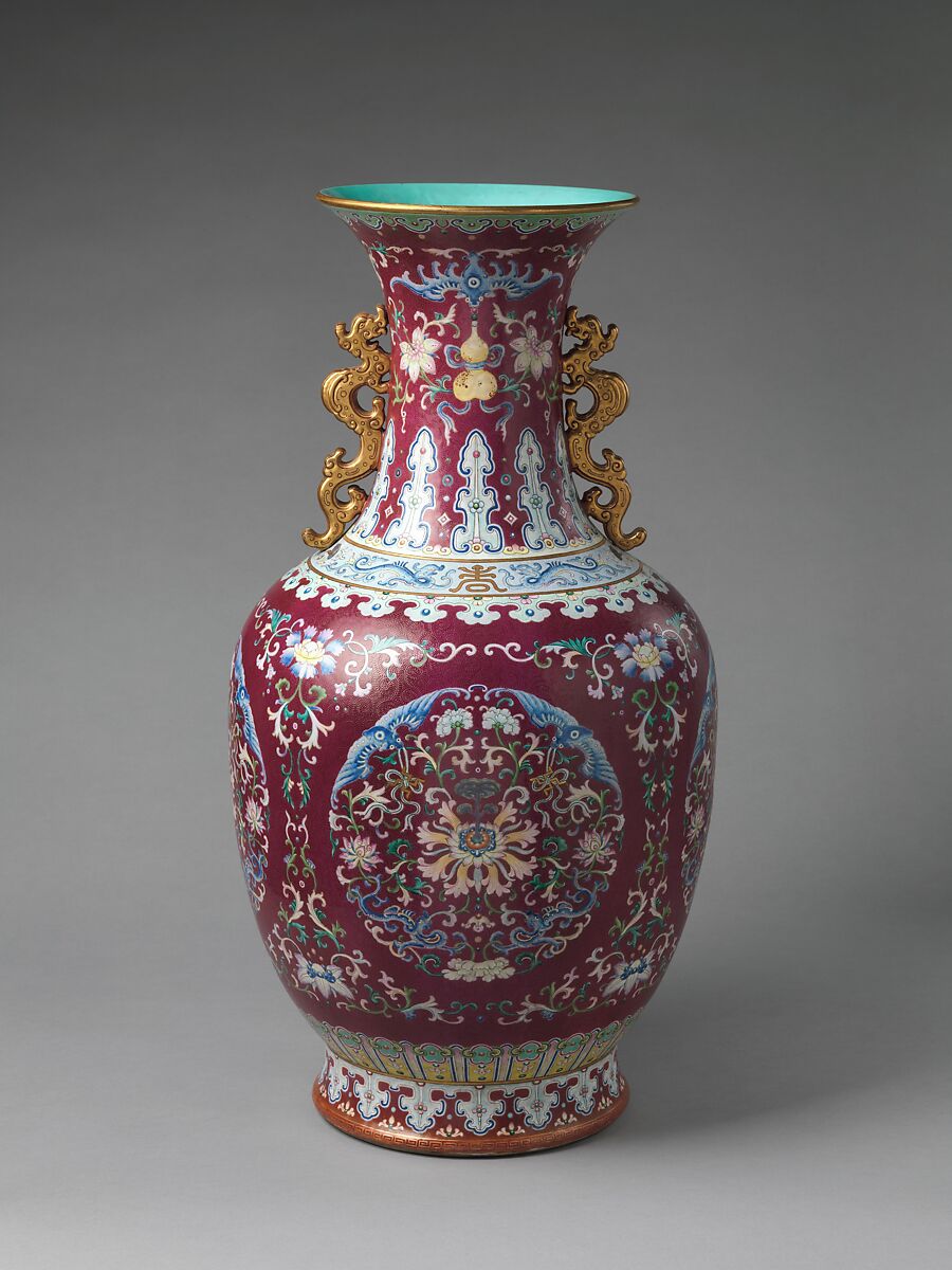 This lavish vase, produced in the imperial kilns of the Qing dynasty, is a virtual compendium of auspicious images, including lotus, dragons, bottle gourds, and more. Particularly prominent are the bats; because “bat” (fu 蝠) sounds like “good fortune” (fu 福) in Chinese, the animals bear this symbolic meaning.
