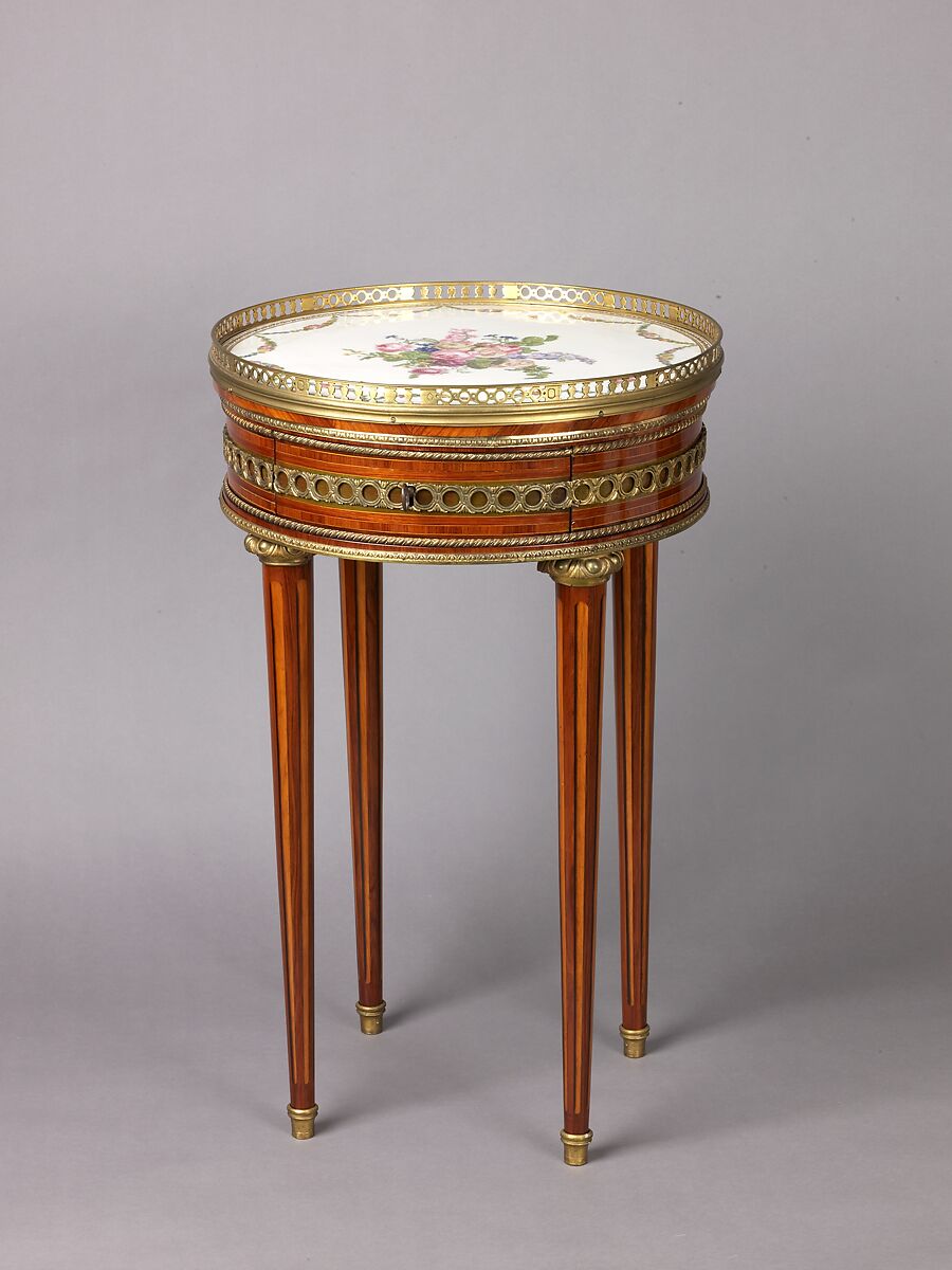 - Medium: Oak veneered with tulipwood, rosewood, green-stained maple, holly stringing; legs veneered with rosewood and partly shaded satinwood; gilt-bronze mounts.
