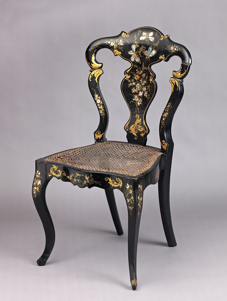 - Medium: Wood, papier-mâché, black lacquer, painted and gilded, mother-of-pearl, caned seat.