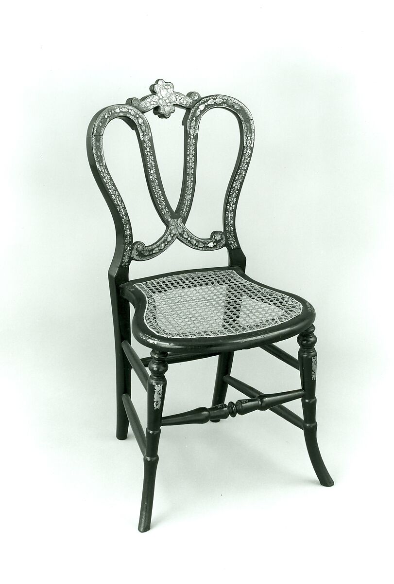- Medium: Wood, papier-mâché, black lacquer, painted and gilded, mother-of-pearl, caned seat.