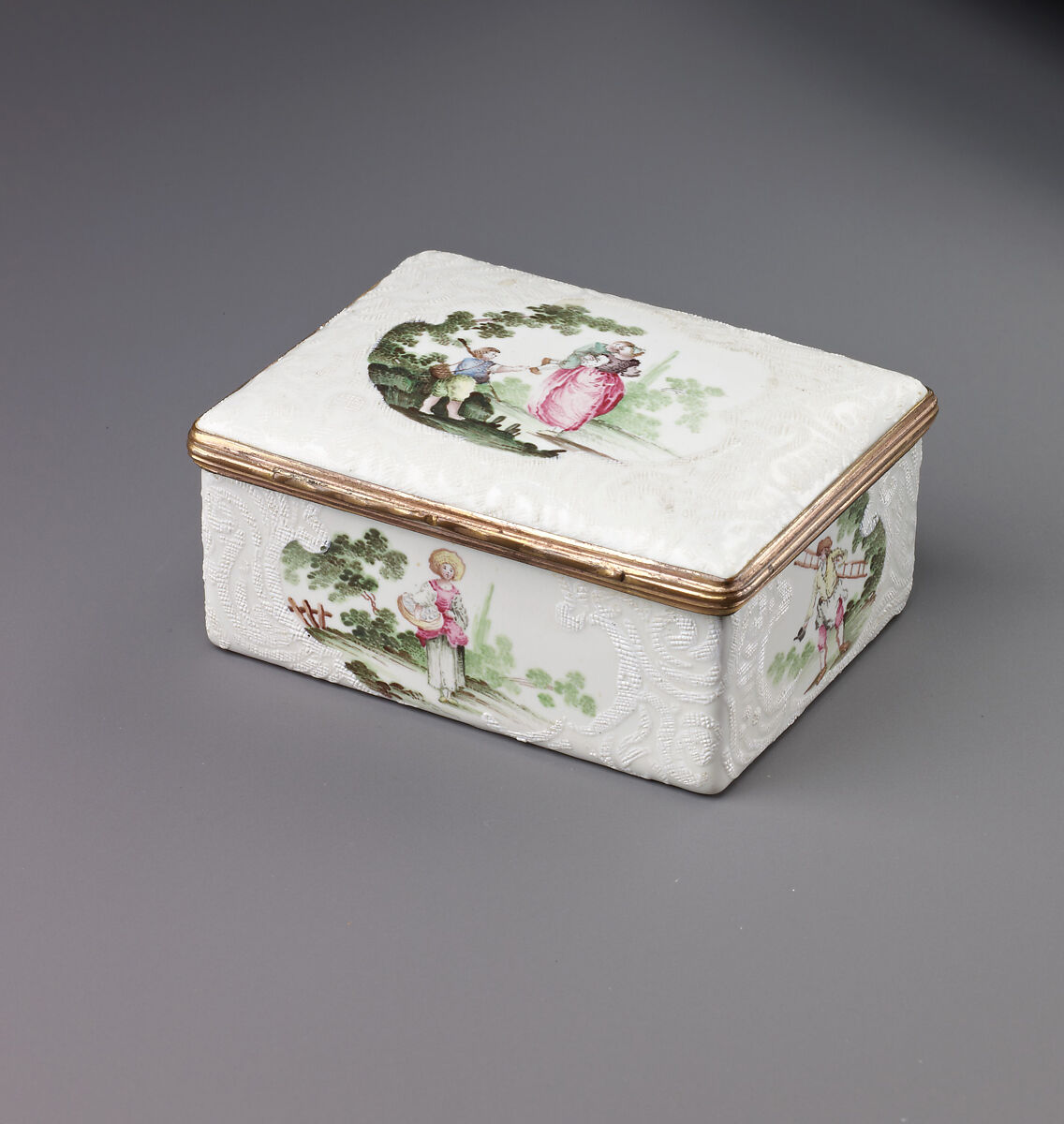 A similarly informal, sketchy technique occurs on other enamel boxes also painted inside the cover with a halflength female figure in dress of about 1750 or earlier.(1) Such miniatures, all undoubtedly after engravings, are common both to enamel boxes and to boxes of Meissen porcelain.(2) Another characteristic feature is the dramatically shaped stippled background in dark tones. On these grounds it is suggested that these enamel boxes also originated in Dresden. The painting inside the cover is not by the same hand as the exterior decoration.