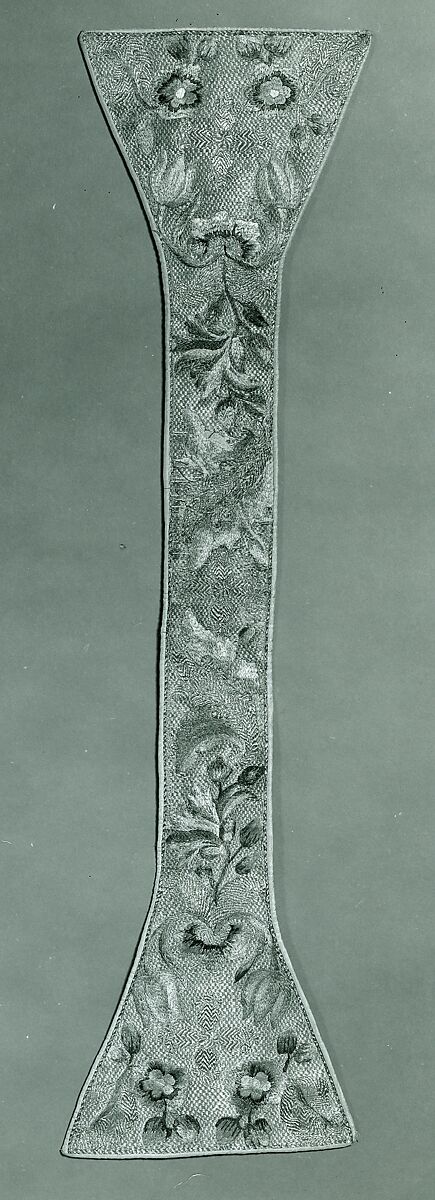 This maniple (worn over the arm by ecclesiastical persons during the celebration of the Mass) forms a set with three other liturgical textiles in the Robert Lehman Collection: a chasuble (1975.1.1797), a stole (1975.1.1799), and a burse (1975.1.1800). The four objects are embroidered in an allover polychrome floral design entirely surrounded by a solidly worked background in silvered metal thread with additional patterns in gilt metal thread. On the chasuble front and back large blossoms are arranged symmetrically on either side of a spray of pink carnations and other flowers placed along the center axis and the background is composed of freely meandering strapwork of wide floral stems and leaves worked in gilt metal thread. The same floral motifs, smaller in scale, appear on the accessories. A large-scale floral design embroidered in a smilar style against a solid background in gilt metal thread decorates a chasuble and two matching dalmatics in the Domschatz, Frankfurt am Main, that has been dated to the eighteenth century, or probably somewhat later than the Lehman vestments. Although this design is almost entirely secular, it was undoutedly made specifically for the Lehman chasuble and its accessories. One faint reference to the objects' religious function is buried in the design just above the carnation at the center of the chasuble back in a small cartouche, possible a coat of arms, containing a pelican piercing its breast to feed its young, a symbol of Christ's sacrifice on the cross. On the maniple and stole there are gilt crosses at the center of both ends of a garland of blossoms, and in the center of the burse is a gilt cross surrounded by tulips and surmounted by a stylized lily.