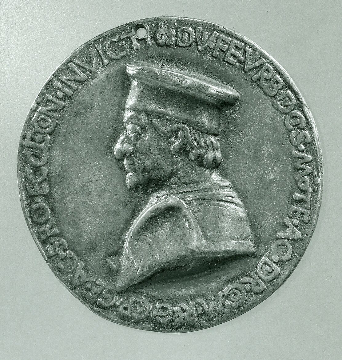 Federigo on horseback. Goethe, who owned a medal of this type, praised Sperandio over Pisanello, on the basis of comparison with Pisanello’s medals of Sigismondo Malatesta. The piece, which is a late aftercast, possibly from the eighteenth or nineteenth century, may be after a lead original of about 1482.
