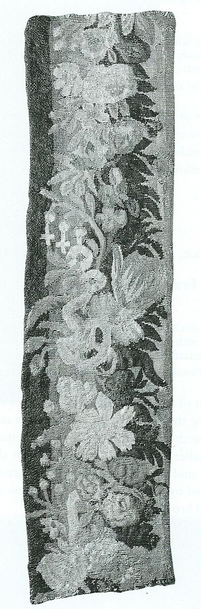 This border fragment together with another in the Lehman Collection (1975.1.2401b) are from a tapestry produced in France or the Netherlands in either the seventeenth or eighteenth century is woven in blue, green, brown, and yellow in a pattern of blossoms and buds, with two curious crosslike devices suspended from buds on a stem. The other, in shades of blue and brown, has a crown on a stand with a festooned swag behind it and flowers and leaves above it.
