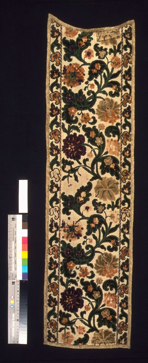 This panel of cut and uncut voided velvet and another in the Lehman Collection (1975.1.1768) were probably originally one long piece that was cut in two to make orphreys for the front and back of a chasuble (a liturgical garment worn during the celebration of the Mass). The polychrome design of a meandering garland of large blossoms and curling leaves is bordered by rows of smaller-scale foliage motifs edged with narrow bands of diagonal lines. The panels are finished with two different types of decorative tape. A polychrome velvet with a similar pattern of large flowers and leaves is in the Kunstgewerbemuseum der Stadt Köln.