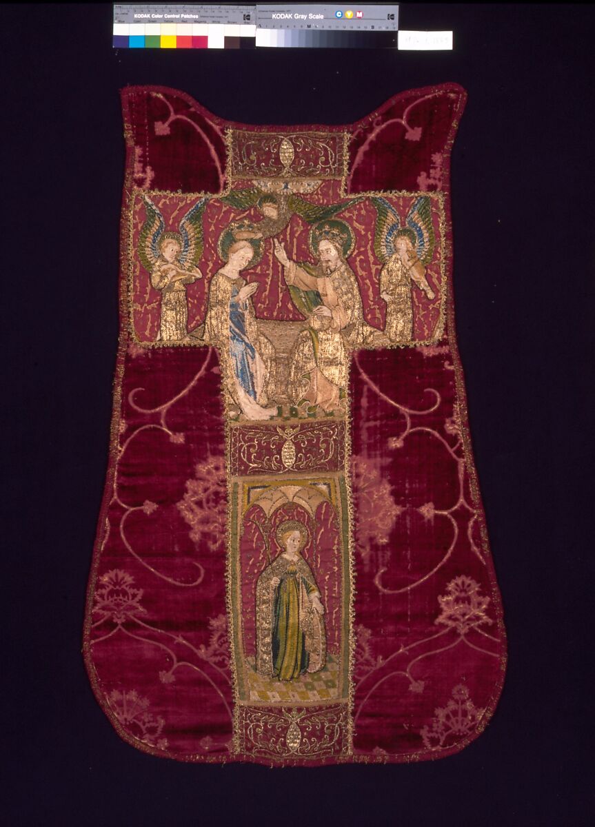 - Medium:Cut velvet, red silk, gilt-metal-strip-wrapped silk, linen.