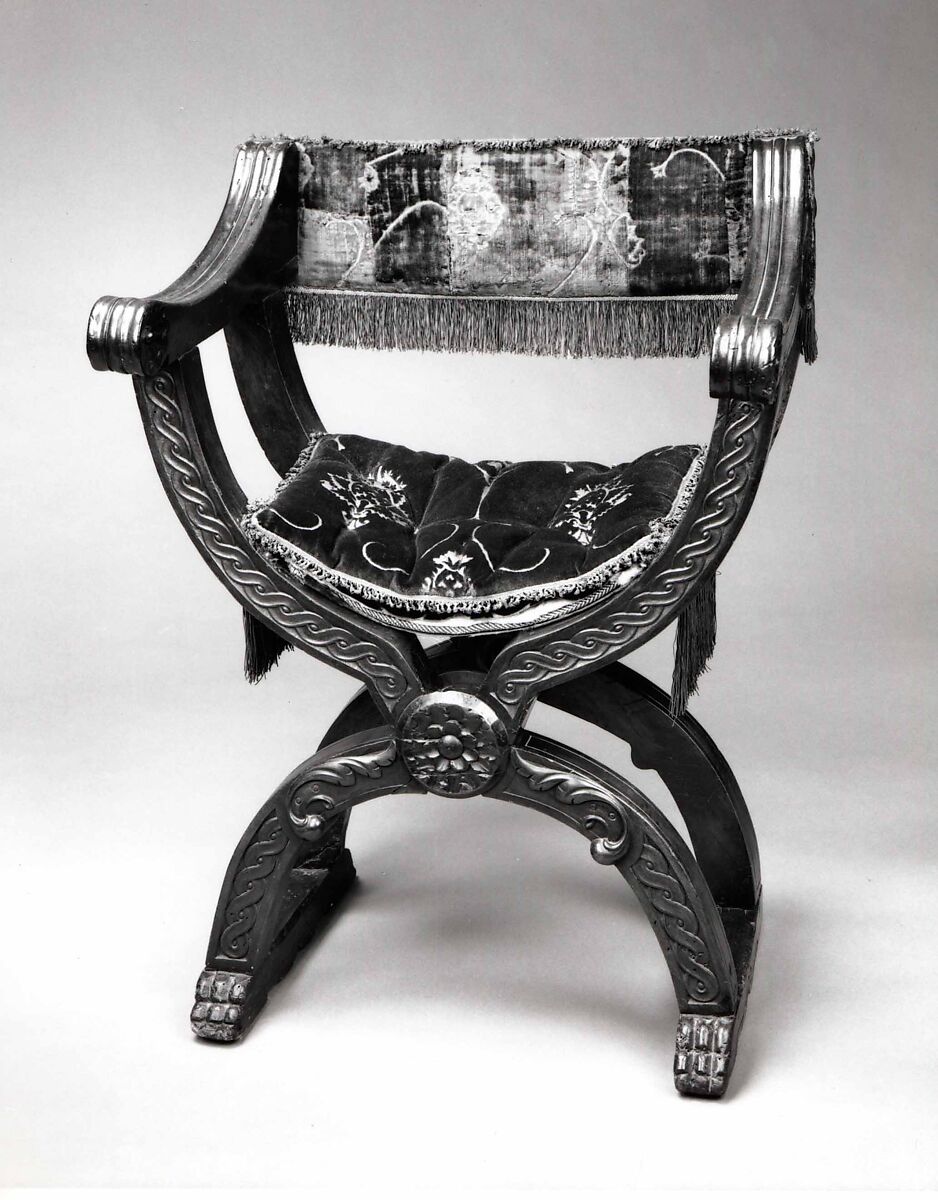 - Medium: Walnut, carved; silk cut velvet, metal.