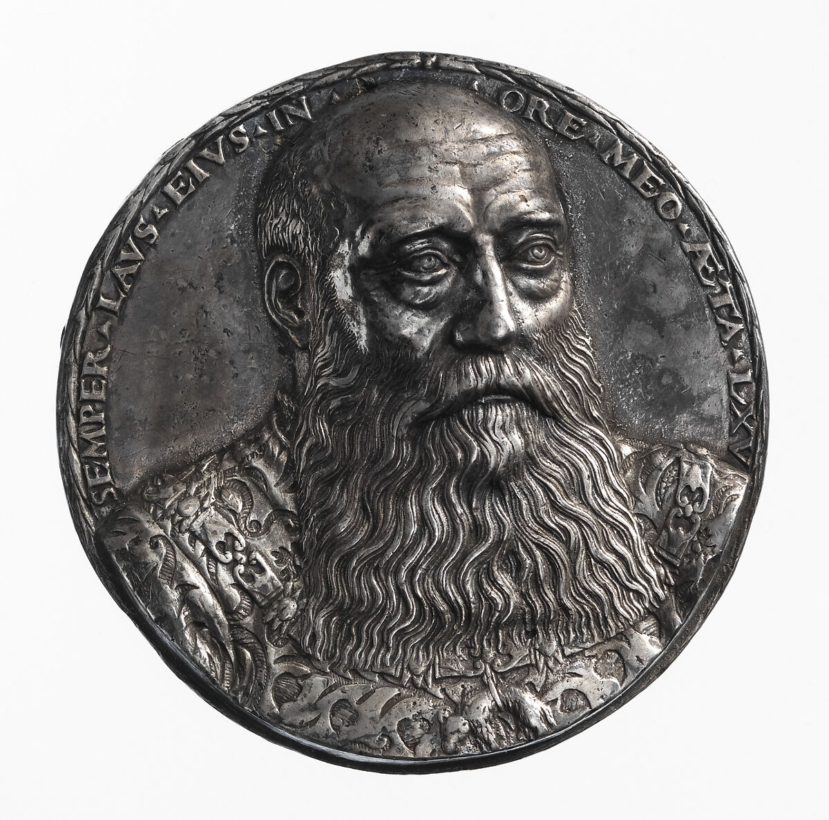 George the Bearded, Duke of Saxony, was one of the more enlightened German princes in the early years of the Reformation. Known as an outstanding ruler, high-minded and deeply concerned for his subjects, he maintained an unerring loyalty to the Holy Roman Emperor. While he initially supported Martin Luther’s Protestant reforms, George ultimately remained a staunch Catholic. This medal’s inscription translates as "His praise shall always be in my mouth." The reverse depicts his coat of arms.