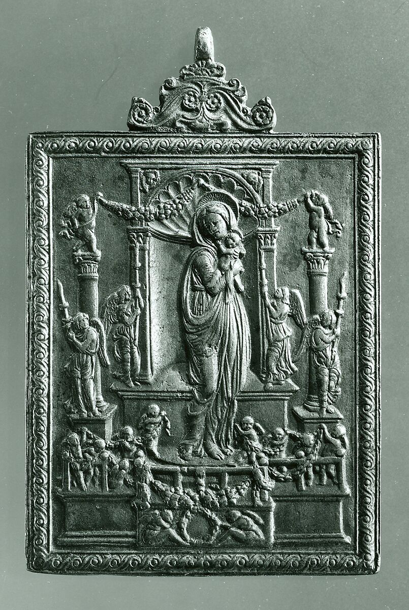 This pax portrays the Virgin and Child surrounded by four angels and eleven amorini holding garlands in an all’antica architectural structure. Many versions are known, including those in the Victoria and Albert Museum, London; the National Gallery of Art, Washington, D.C.; and the Diocesan Museum, Pienza [mounted as a pax]). It has been ascribed to a Ferrarese artist, influenced by Cosmè Tura, as well as to the schools of Padua and Siena. This aftercast has some loss of detail and traces of wear.
