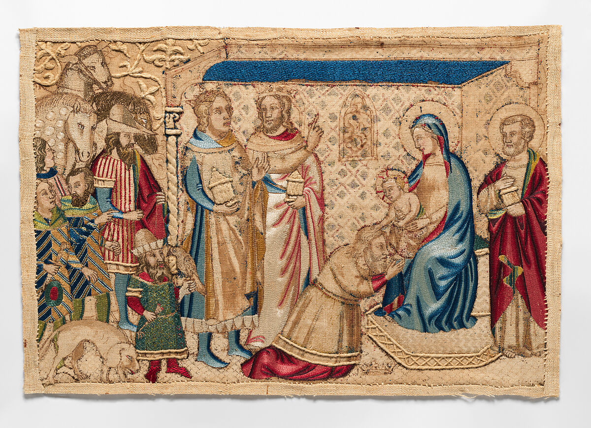 - Medium: Linen and cotton plain weave underlaid with linen plain weave and embroidered with silk and gilt-metal-strip-wrapped silk in bullion, split, and stem stitches, laid work, couching, and couching padded with cotton (couched with linen). Underdrawing and wash in sepia ink. Edging: hemp plain weave