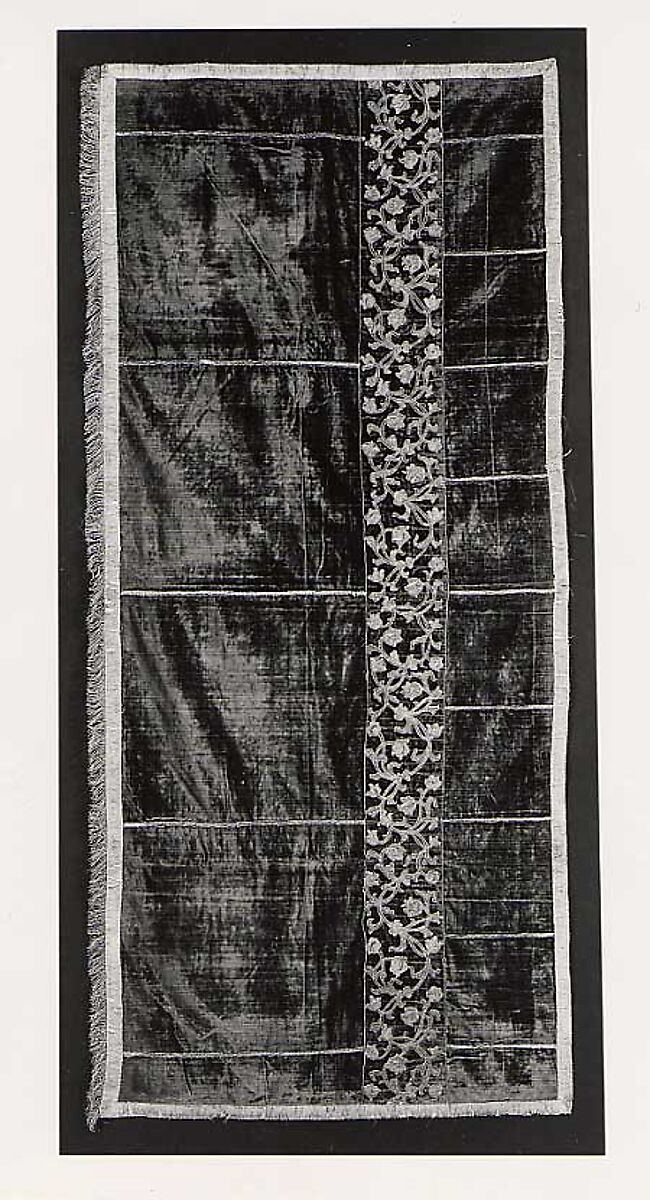At least six pieces of an Italian fifteenth-century green velvet make up this antependium (altar frontal), which is sectioned into squares with narrow silver tape. The edges are finished with wide silk and silver-gilt tape and the bottom is fringed. The appliquéd needlework border across the upper quadrant was worked over padding in gold and silver thread in a meandering scroll pattern reminiscent of Italian needle lace designs. It probably dates from the sixteenth or seventh century.