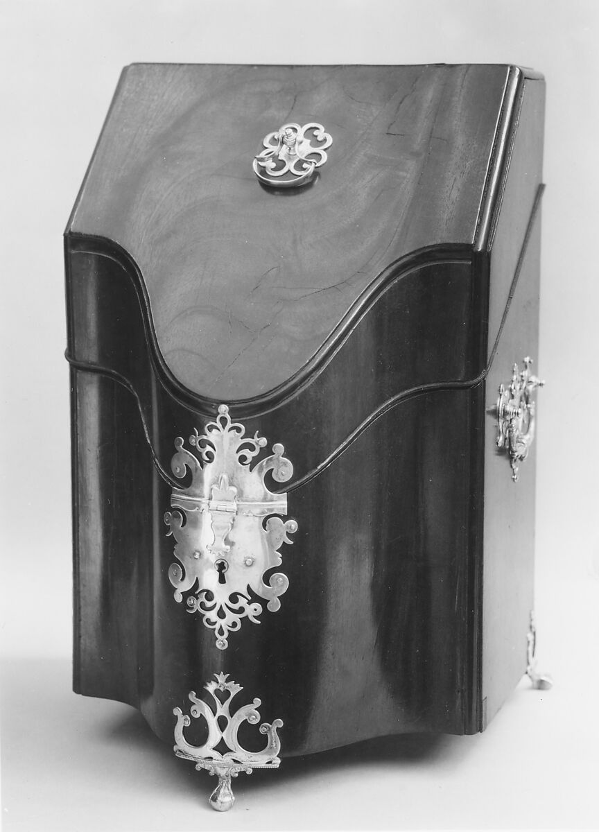 This type of knife case, one of a set of three, was popular in England beginning in the late seventeenth century, and cases like this one, veneered with mahogany and embellished with silver mounts, were popular there in the late eighteenth century. The rare New York attribution of this box is substantiated by the tulip poplar secondary wood and the silver mounts bearing the mark, Fueter, for one of the families of New York silversmiths. Their Rococo manner suggests that the mounts were made by Lewis Fueter or his brother, Daniel. Knife cases were generally sold in pairs, but also like these, in sets of three.